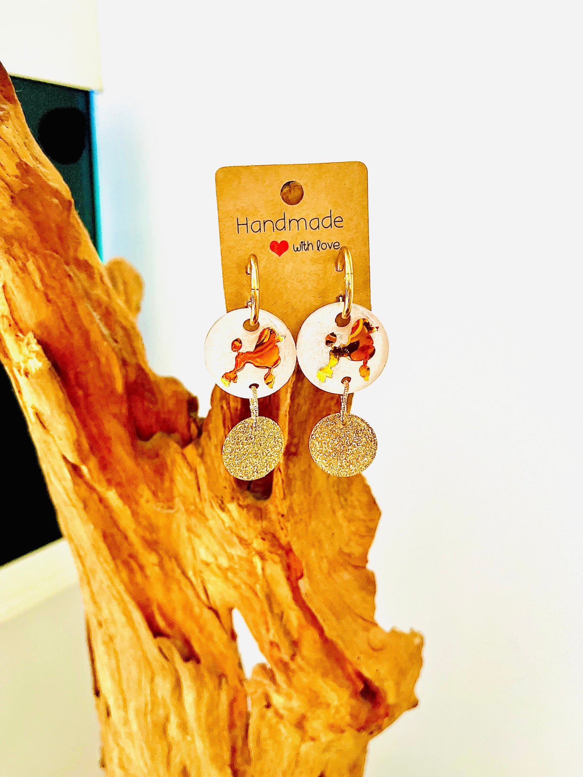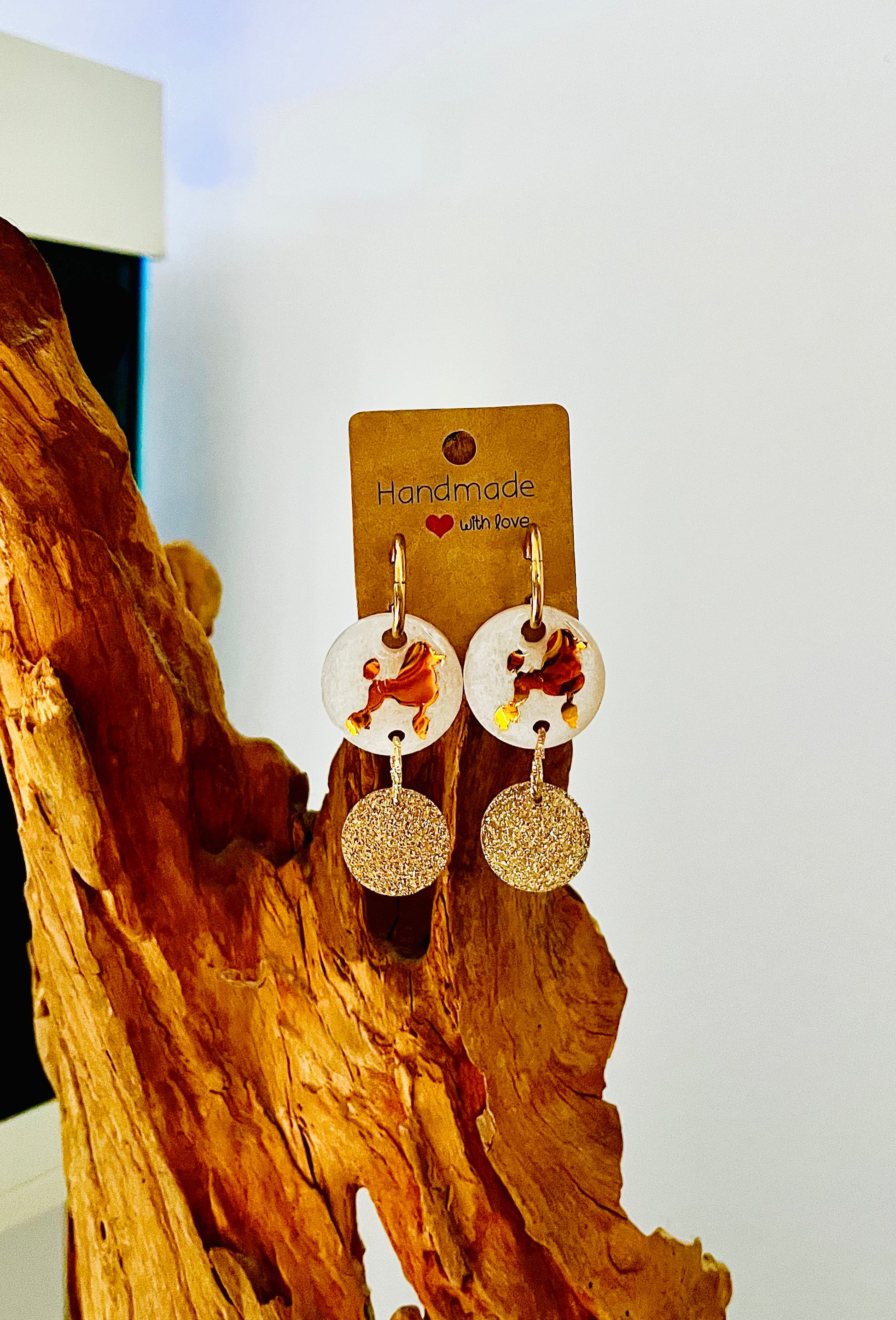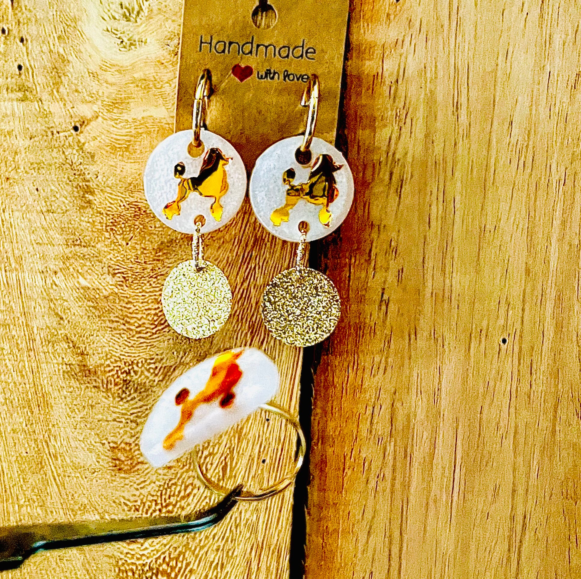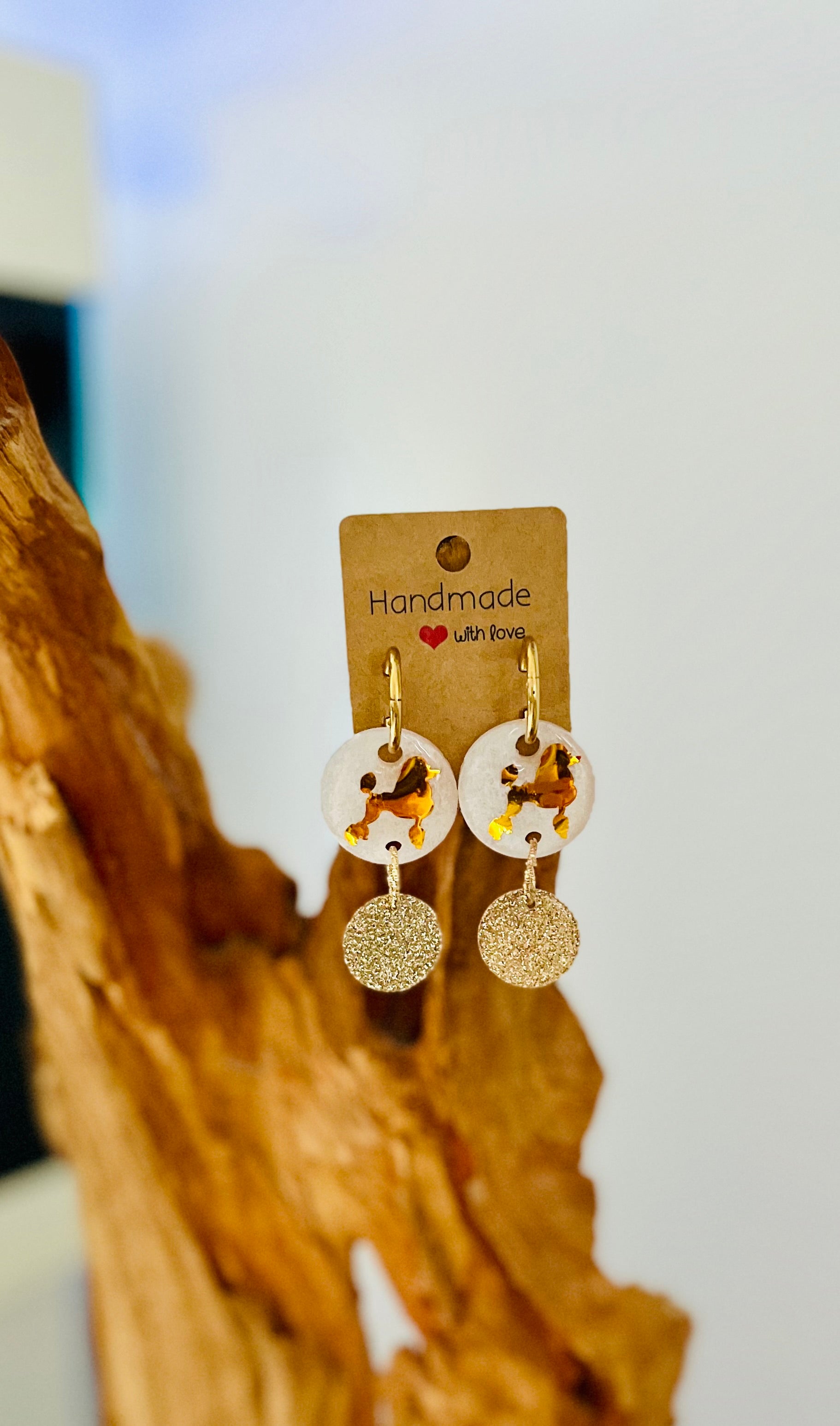 Boucle d’oreilles Créole blanc nacré et caniche doré accompagné d’une breloque dorée à paillettes