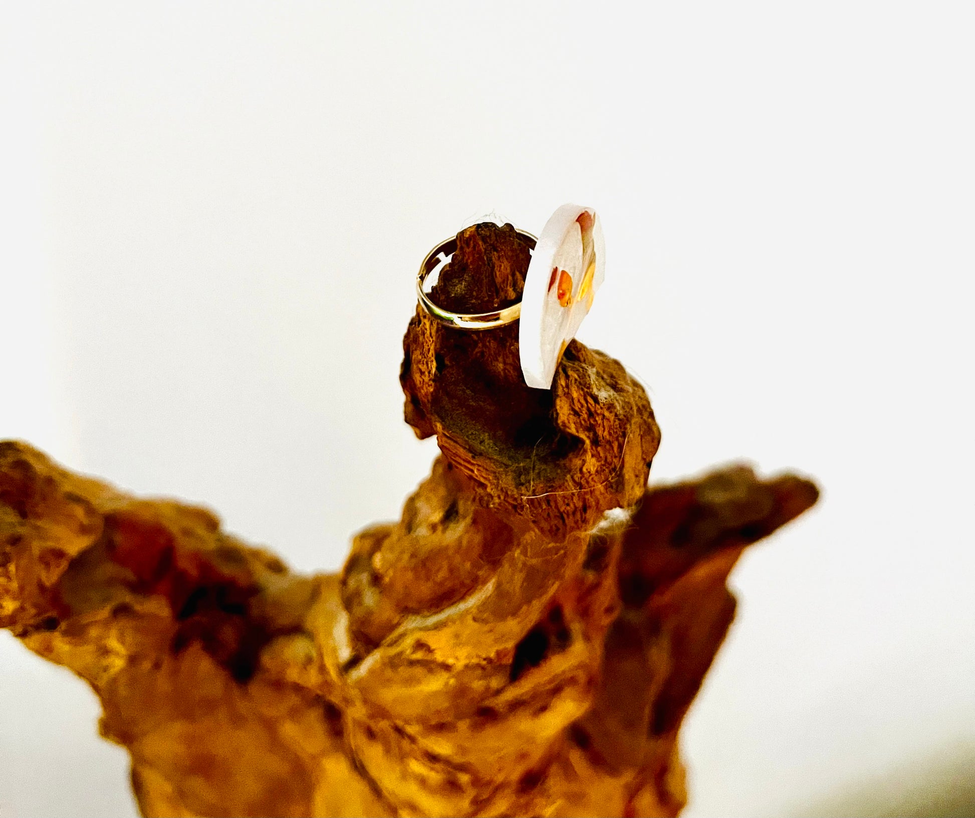 bague en résine blanche nacrée et caniche doré, elle est réglable et en acier inoxydable